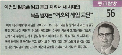 「종교라는 것은 원시적인 종교도 있고 종말적인 종교도 있는 것이니 종교의 근본은 양을 잡아서 제사를 드리는 데서부터가 시발점이 되었다(창4:4). 이것은 죄진 인간이 종말적인 종교를 이루기까지 영자(影子)적인 종교에 불과했다(히10:8-14). 그때는 뚜렷한 의식이나 또는 법이나 언약의 말씀이 책이 없는 양심에서 움직이는데 불과한 종교다. 그러나 양심이 하나님을 향하는 종교는 발전했고 양심이 정욕으로 흐르는 종교는 타락했던 것이다(롬1:21-23). 그러므로 기독교는 양심이 하나님을 향하는 종교로서 흘러오는 데서 완전한 언약을 세우는 시대를 구약이라 하고 그 언약을 열매로 끝을 맺는 종교를 신약 시대라 하는 것이다(딤후1:3). 열매를 이루는 종교도 다음과 같이 향상한다. 중생을 목적한 종교 이것은 온 세계 인류가 사망 아래에서 죽은 영들을 살려서 하나님의 자녀의 권세를 얻도록 하는 것을 기독교의 십자가의 도라 하는 것이다(요1:12). 그러나 온 세계 인류가 전멸되는 환난과 재앙이 올 때에 남은 종 남은 백성으로서 활동하는 역사를 새 일의 역사라는 진리다. 이것은 양심적인 종교가 승리를 이루는 즉 완전 결실을 이루는 지상 평화 왕국을 이루는 일을 말한다(사43:19-21). 그러므로 개인적인 종교가 민족적인 종교로 발전했고 민족적인 종교가 세계적인 종교로 발전했고 세계적인 종교가 완전히 평화 왕국으로 끝을 맺는 것이 종교의 발전이라는 것이다(사9:1-7). 이 평화왕국은 지상에서 천년동안 이루어지되 조물주 하나님의 피조물인 만물과 인간이 지상 축복을 받는 때이다. 이것은 완전한 천국이 아니요, 지상 평화 왕국이다. 하나님께서 천지 만물을 창조한 후에 아담에게 축복을 주었지만 아담 하와가 간교한 뱀에게 미혹을 받아 범죄하므로 이 땅은 저주를 받고 창조의 본의를 발휘하지 못하고 있었지만 둘째 아담 예수로 말미암아 조물주 하나님의 창조의 본의를 다시 이루어 놓는 것을 천년 왕국이라는 것이다.」